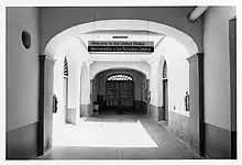 In the interior, the central passage extends from front to rear through the open courtyard, paved in quarry tiles. On the left side at the front of the building, are two Immigration and Naturalization Service offices. On the right front are two U.S. Department of Agriculture offices. Behind the offices on the left side of the passage is a fine enclosed stair with two runs and a landing. The remaining first-floor rooms are storage rooms and a shop with concrete floors, several 8' wide masonry openings with slat fanlights (sol truncos). Storage room windows are solid vertical board shutters without sash and with outside metal grilles. Two rooms flanking the passage in the center fill in an original part of the courtyard in a manner similar to the older construction.[10]