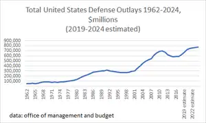 In the 2010 United States federal budget, the Department of Defense was allocated a base budget of $533.7 billion, with a further $75.5 billion adjustment in respect of 2009, and $130 billion for overseas contingencies.[44] The subsequent 2010 Department of Defense Financial Report shows the total budgetary resources for fiscal year 2010 were $1.2 trillion.[45] Of these resources, $1.1 trillion were obligated and $994 billion were disbursed, with the remaining resources relating to multi-year modernization projects requiring additional time to procure.[45] After over a decade of non-compliance, Congress has established a deadline of Fiscal year 2017 for the Department of Defense to achieve audit readiness.[46]