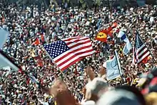 It was not until 2000 that another United States Grand Prix took place, this time at the Indianapolis Motor Speedway in Indiana. Indianapolis was rumored to have been considering a Formula One race since the USGP left Phoenix; with a proposed street race for the 1990 season in downtown Indianapolis.[44] The 2.606-mile (4.194 km) infield road course uses about a mile of the oval, but in a clockwise direction. The crowd at the 2000 race was estimated at over 225,000, one of the largest ever in F1.[45] Michael Schumacher's win was his second of four straight to end the season as he overtook Mika Häkkinen for his third Championship. In 2001, the race took place less than three weeks after the September 11, 2001 attacks in the US, and many teams and drivers featured special tributes to the USA on their cars and helmets. The 2002 edition saw Schumacher and teammate Rubens Barrichello trading places near the finish line as Schumacher attempted to engineer a dead heat with Barrichello. Held in September in its first four years (in order to distance it from the "500" and NASCAR's Brickyard 400), the USGP at Indianapolis was moved to an early summer date in 2004 in late June, 3 weeks after the Indy 500 so it could be paired with the Canadian Grand Prix and to make room for new Asian rounds. In 2005, problems with Michelin tires led to seven teams withdrawing from the race after the formation lap. Only the three teams (six cars) with Bridgestone tires started the race, and the event was considered a farce.[46] Many commentators questioned whether a United States Grand Prix would be held in Indianapolis again, but the 2006 United States Grand Prix was held the next year, on July 2, 2006, without controversy.
