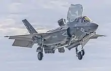 Marine attack squadrons (VMA) fly the AV-8 Harrier II; while Marine Fighter-Attack (VMFA) and Marine (All Weather) Fighter-Attack (VMFA(AW)) squadrons, respectively fly both the single-seat (F/A-18C) and dual-seat (F/A-18D) versions of the F/A-18 Hornet strike-fighter aircraft. The AV-8B is a VTOL aircraft that can operate from amphibious assault ships, land air bases and short, expeditionary airfields.[58] The F/A-18 can only be flown from land or aircraft carriers. Both are slated to be replaced by the F-35B, the STOVL version of the F-35 Lightning II.[59] The Marine Corps will also purchase 80 of the F-35C carrier variants, enough for five squadrons, to serve with Navy carrier air wings.[60][61][62]