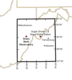 The Quiet Zone is an approximate rectangle of land, 107.0 miles (172.2 km) on the north edge, 109.6 miles (176.4 km) on the south edge and 120.9 miles (194.6 km) on the east and west edges, comprising approximately 13,000 square miles (34,000 km2; 8,300,000 acres). It straddles the borders of Virginia and West Virginia, and also includes a sliver of Maryland. The NRQZ is centered between the Green Bank Observatory in Green Bank, West Virginia, and Sugar Grove Station in Sugar Grove, West Virginia. It includes all land with latitudes between 37° 30′ 0.4″ N and 39° 15′ 0.4″ N, and longitudes between 78° 29′ 59.0″ W and 80° 29′ 59.2″ W.[1]