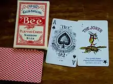 Bee is a casino card brand also sold at retail. They were first manufactured by the New York Consolidated Card Company in 1892, hence the number "92" on the Ace of Spades; the USPC acquired the company two years later, but it continued to operate independently, even after merging with Andrew Dougherty and Standard Playing Card Company to form Consolidated-Dougherty. Standard Bee playing cards have a diamond back, typically blue or red, though casinos frequently use customized Bee cards featuring a logo added to the various colored backs. Unlike Bicycle cards, Bee cards usually have borderless backs, making the facing of any card that is even partially revealed clearly visible. However, the standard diamond back of the card is very regular and low-profile compared to other back designs, which simplifies "bottom-dealing" and some other forms of sleight-of-hand.