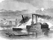 On July 15, the Queen of the West, USS Carondelet, and USS Tyler engaged the Confederate ironclad ram CSS Arkansas in the Yazoo River. The Arkansas was heavily damaged but escaped into the Mississippi River and took refuge under the Confederate batteries at Vicksburg, Mississippi. On July 22, Queen of the West and USS Essex attacked Arkansas, despite the batteries at Vicksburg. The Queen of the West rammed the Arkansas but inflicted only minor damage and rejoined the Mississippi River Squadron ships above Vicksburg.[11] The ram fleet ships also conducted activities in the Yazoo River clearing mines and engaging Confederate batteries.[12]