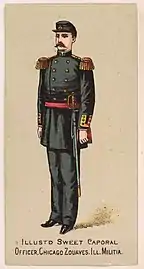 The Chicago Zouaves had uniforms that borrowed heavily from, without strictly copying, French Zouaves from which they drew inspiration.[26] Enlisted men in the Chicago Zouaves wore uniforms that consisted of red kepi, red chasseur trousers with white gaiters, and an open-fronted, beaded blue blouse worn with a yellow waist sash.[14][27] Officer uniforms consisted of straight-legged trousers and blue blouses with choker collars.[27] The loose-fitting chasseur trousers worn by enlisted personnel allowed greater fluidity of movement than traditional, straight-legged trousers[26] allowing them to perform their drill movements.