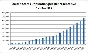 When talking about the populations within California's reapportioned House districts in 1951, a report from Duke University found that "[there] is not an excessive disparity in district populations, but [the populations and disparities are] perhaps larger than necessary."[11] If the House continued to expand as it did prior to the Reapportionment Act of 1929, it would currently have 1,156 members (still just the second largest lower house, after China).[12] This would give the representatives, on average, about 287 thousand constituents, on par with Japan's National Diet.