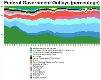 Social Security, Medicare, and Medicaid expenditures are funded by more permanent Congressional appropriations and so are considered mandatory spending.[31] Social Security and Medicare are sometimes called "entitlements", because people meeting relevant eligibility requirements are legally entitled to benefits; most pay taxes into these programs throughout their working lives. Some programs, such as Food Stamps, are appropriated entitlements. Some mandatory spending, such as Congressional salaries, is not part of any entitlement program. Mandatory spending accounted for 59.8% of total federal outlays (net of receipts that partially pay for the programs), with net interest payments accounting for an additional 6.5%. In 2000, these were 53.2% and 12.5%, respectively.[9]