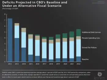 CBO estimated, under the baseline projection, that public debt would rise from 69% GDP in 2011 to 84% by 2035.[57] In the long run, lower deficits and debt would have led to relatively higher growth estimates. But, in the short run, real GDP growth in 2013 would have likely been reduced to −0.5% from 1.1%. This would mean a high probability of recession (a 1.3% GDP contraction) during the first half of the year, followed by 2.3% growth in the second half.[58][59]