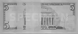 On the back of the bill, a larger, purple numeral "5" appears in the lower right corner to help those with visual impairments to distinguish the denomination. This large "5" also includes the words "USA FIVE" in tiny white letters.
