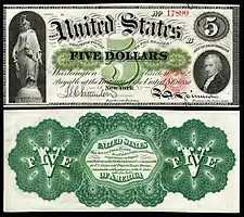 - 1862: The first $5 United States Note was issued with a face design similar to the previous Demand Note and a completely revised reverse.