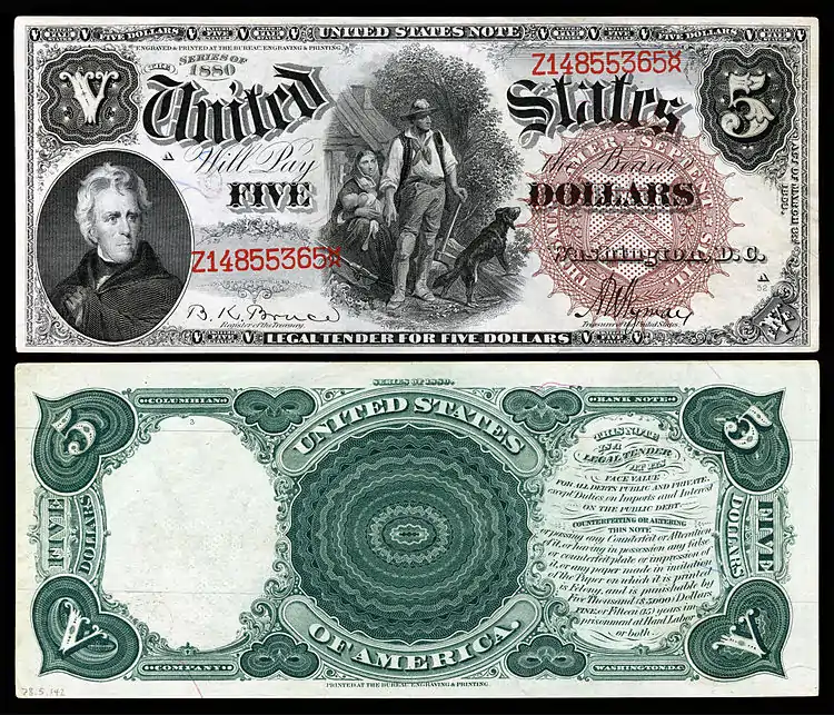 - 1869: A new $5 United States Note was issued with a small portrait of Andrew Jackson on the left and a vignette of a pioneer family in the middle.