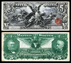 - 1890: Five-dollar Treasury or "Coin Notes" were issued and given for government purchases of silver bullion from the silver mining industry. The reverse featured an ornate design that occupied almost the entire note.