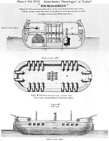 Demologos was the first warship to be propelled by a steam engine. She was a wooden floating battery built to defend New York Harbor from the Royal Navy during the War of 1812. The vessel was designed to a unique pattern by Robert Fulton, and was renamed Fulton after his death. Because of the prompt end of the war, Demologos never saw action, and no other ship like her was built.