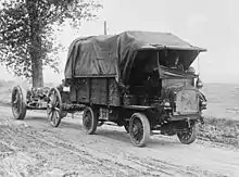 Before U.S. entry in WW I, many American-made heavy four-wheel drive trucks, notably made by Four Wheel Drive (FWD) Auto Company, and Jeffery / Nash Quads, were already serving in foreign militaries, bought by Great Britain, France and Russia. When WW I started, motor vehicles had begun to replace horses and pulled wagons, but on the European muddy roads and battlefields, two-wheel drive trucks got stuck all the time, and the leading allied countries could not produce 4WD trucks in the numbers they needed.[58] The U.S. Army wanted to replace four-mule teams used for hauling standard 11⁄2 U.S. ton (3000 lb / 1.36 metric ton) loads with trucks, and requested proposals from companies in late 1912.[59] This led the Thomas B. Jeffery Company to develop a competent four-wheel drive, 11⁄2 short ton capacity truck by July 1913: the "Quad".