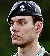 Throughout its history, Army soldiers and their units have adopted different headgear and headgear devices—such as color accoutrements, insignias, and flashes—signifying special capabilities and unique roles of soldiers and their units.[9][10] An example of this tradition started in World War II with the adoption of airborne insignias which were authorized for wear by military parachutists and glider-born forces on specific assignments and by those assigned to airborne units.[11][12] The airborne insignias were worn on the left-side front (for enlisted and NCOs) or right-side front (for officers) of the former Army service uniform's service cap.[11][12] Different variants of airborne insignias were worn until later in World War II when parachute and glider formations combined their unit-specific insignias into one red, white, and blue Airborne Insignia.[13] Although airborne units began to wear the maroon beret as their official headgear in the 1980s, the service cap with Airborne Insignia continued to be authorized for wear until the black beret became the standard Army headgear in 2000.[12][14][15]
