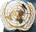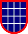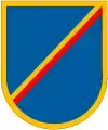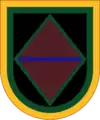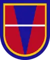 In the United States (US) armed forces of today, a beret flash is a shield-shaped embroidered cloth or large polished metallic insignia that is usually attached to a stiffener backing of a military beret. The attached beret flash is worn over the left eye of the wearer with the excess cloth of the beret shaped, folded, and pulled over the right ear giving it a distinctive appearance.[1][2] The embroidered designs of the Army's beret flashes represent the distinctive heraldic colors and patterns of units with unique missions or represent the Army overall while the Air Force's represent their Air Force Specialty Code (AFSC) or their assignment to a unit with a unique mission.[2][3] Joint beret flashes, such as the United Nations Beret Flash—attached to the United Nations Peacekeepers ligh-blue beret—the Multinational Force and Observers Beret Flash—attached to a terracotta-colored beret—and the Joint Communications Support Element Beret Flash—attached to a maroon beret—are worn by all or most of the US armed forces while assigned to a specific joint units.[4][5][6]