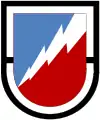 Other examples of this tradition can be seen with the adoption of organizational beret flashes worn to signify a specific formation of a specialized unit, such as a combat advisor, airborne, ranger, or special forces unit.[3][9][15] It is not clear when organizational beret flashes began to be used by the Army. However, historical Army films and photographs suggest the modern–day organizational beret flash may have been introduced in late 1961, around the time the green beret was officially authorized for wear by members of the Army's special forces.[16][17][18][19][20][21] Prior to that time, the green beret was worn informally by those assigned to special forces units who used their Parachutist Badge as their beret flash. The Parachutist Badge was worn high on the beret positioned either over the left eye or left temple and officers would wear their polished metal rank insignia below their badge.[16] As these special forces units began to adopt their organizational beret flashes, they also adopted rules as to who in their unit would be allowed to wear them.[22] For example, only special operations qualified paratroopers were authorized to wear their special forces unit's organizational beret flash while none-qualified soldiers wore a cloth recognition bar, color and pattern matched to their unit's organizational beret flash, below their DUI or officer rank insignia.[10][22][23]