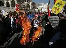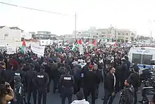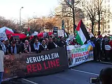 On December 11, Sayyed Hassan Nasrallah, the leader of Lebanese Hezbollah, said the organization would once again focus on Israel and the Palestinian cause. He urged Arab states to abandon the peace process and called for a new Palestinian uprising.[122] The same day, thousands of Hezbollah supporters demonstrated in Beirut, chanting "Death to America! Death to Israel!" while waving Palestinian and Hezbollah flags.[74]