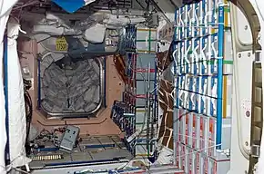 Essential space station resources such as fluids, environmental control and life support systems, electrical and data systems are routed through Unity to supply work and living areas of the station. More than 50,000 mechanical items, 216 lines to carry fluids and gases, and 121 internal and external electrical cables using six miles of wire were installed in the Unity node.[3] It is made of aluminium and stainless steel,[4] or aluminium alloy.[5]