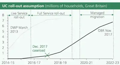 While the DWP had estimated administration costs for the roll-out of Universal Credit to be £2.2 billion, by August 2014 this estimate had risen to £12.8 billion over its "lifetime" and was later increased again to £15.8 billion.[47] Much of the increased cost was linked with software problems and duplication of systems needed to pay out new and legacy benefits. The initial roll-out proceeded much more slowly than had been originally planned, and led to the early departure of several senior leadership figures.[48] In 2018 the National Audit Office maintained Universal Credit could incur higher administrative costs than the systems it replaces.[49] A study by the Resolution Foundation published in November 2018 also predicted that Universal Credit will cost more than the older system of benefits it is replacing.[50]