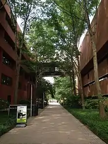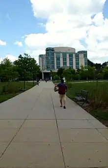 Academic Row is known to be the central pedestrian concourse and maintenance vehicle highway in the campus that borders along a series of buildings. Beginning south at Administration Drive, the pathway is covered by mature trees on either side. Friendly squirrels are a common sight near the University Center where students tend to feed them waffle fries from Chick-fil-A.[37] Academic Row is bordered by the Administration Building, the Retriever Activities Center, Janet and Walter Sondheim Hall, Sherman Hall (Previously named Academic IV), University Center, Math and Psychology Building, Biological Sciences Building, and the Meyerhoff Chemistry Building. At the northern end, the walkway is intersected by Schwartz Breezeway leading to the Commons, the university's student union. Academic Row terminates at the Albin O. Kuhn Library & Gallery, where multiple paths radiate across Erickson Field towards the Commons, the Physics and Public Policy Buildings, West Hills, Hillside, and Terrace Apartments, as well as additional dormitories.[38]