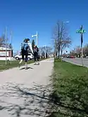 The University of North Dakota's main campus sits in the middle of Grand Forks on University Avenue. The campus is made up of 240 buildings (6.4 million square feet) on 550 acres (2.2 km2).[3] The campus stretches roughly one and half miles from east to west and is divided by the meandering English Coulee. The western edge is bordered by Interstate 29, the eastern edge is bordered with University Park, the Grand Forks railyards sit on the south side, and the north side is marked by U.S. Highway 2 which is called Gateway Drive in Grand Forks.