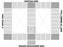 The structure is a rectangular building having a dimension of 86 meters long and 74 meters wide with two interior courtyards or patios. The most significant feature is the fact that it is actually made up of 40 separate structures independent from one another with the only opportunity provided by pre-cast stab flooring.[4] But some locations of the separations are now difficult to determine exactly because of the numerous cosmetic changes the interior of the building which has undergone over the years. According to an article written by the former dean of Faculty of Engineering, Manuel Mañosa, this is how it is divided: