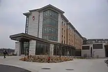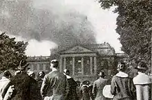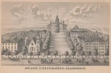 The university had its official beginnings when the Wisconsin Territorial Legislature in its 1838 session passed a law incorporating a "University of the Territory of Wisconsin", and a high-ranking Board of Visitors was appointed. However, this body (the predecessor of the U.W. board of regents) never actually accomplished anything before Wisconsin was incorporated as a state in 1848.[18] The Wisconsin Constitution provided for "the establishment of a state university, at or near the seat of state government..." and directed by the state legislature to be governed by a board of regents and administered by a Chancellor. On July 26, 1848, Nelson Dewey, Wisconsin's first governor, signed the act that formally created the University of Wisconsin.[19] John H. Lathrop became the university's first chancellor, in the fall of 1849.[20] With John W. Sterling as the university's first professor (mathematics), the first class of 17 students met at Madison Female Academy on February 5, 1849. A permanent campus site was soon selected: an area of 50 acres (20.2 ha) "bounded north by Fourth lake, east by a street to be opened at right angles with King street", [later State Street] "south by Mineral Point Road (University Avenue), and west by a carriage-way from said road to the lake." The regents' building plans called for a "main edifice fronting towards the Capitol, three stories high, surmounted by an observatory for astronomical observations."[21] This building, University Hall, now known as Bascom Hall, was finally completed in 1859. On October 10, 1916, a fire destroyed the building's dome, which was never replaced. North Hall, constructed in 1851, was actually the first building on campus. In 1854, Levi Booth and Charles T. Wakeley became the first graduates of the university, and in 1892 the university awarded its first PhD to future university president Charles R. Van Hise.[22]