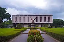 The 1,098 ha (2,710-acre) Los Baños campus houses UPLB's academic facilities, as well as experimental farms for agriculture and biotechnology research.[4] The more prominent buildings in the Los Baños campus, such as the Dioscoro L. Umali Hall, Main Library, and Student Union were designed by National Artist for Architecture Leandro Locsin.[36] Other notable landmarks include the iconic Oblation, Alumni Plaza, Freedom Park, and Baker Memorial Hall.
