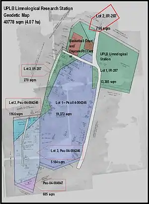 At the time it was reserved, the Station ground directly bordered Laguna de Bay. However, there has been built up - as a result in part of the accumulation of sand and shell by constant wave action and in part of the recession of the lake's water - a foreshore accretion between the original reservation and the Lake. Since the Station's research activities in the waters of the Lake cannot very well be carried out without direct access to it, the Station's premises were extended, as the waters of the Lake receded, to this accretion area. Aware of the need for a Freshwater Research Center, then Philippine President Ferdinand E. Marcos proclaimed the Reservation Area under Proclamation No. 1678, thereby amending Proclamation No. 176, signed at UPLB on October 10, 1977 making the Station's total land area at 4.077 hectares.