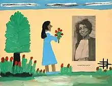 Untitled is a self-portrait by Hunter. Keeping with many of her paintings, the painting is a landscape work, with a cloudy sky on the top and a tree and flowers growing from the bottom. An African American woman stands in the middle with a blue dress and her hands outstretched with a bouquet of roses. She faces a cut out, from an exhibition brochure from 1974, that features a photograph of the artist. Hunter's signature is on the lower proper left.[1]