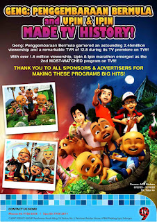 As the third season reaches its conclusion in late 2009, TV9 reports that Upin & Ipin was viewed by 1.6 million, making it the second most-viewed programme on the channel, just behind the free TV premiere of Geng which was watched by 2.45 million (scoring TVR 12.8).[19]