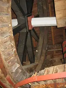 The Upright Shaft is wooden, in two sections for reasons noted above. It is twelve sided, 18 inches (460 mm) across the flats and 30 feet 4 inches (9.25 m) long in total. The Wallower is of compass arm construction, 5 feet 4 inches (1.63 m) diameter with 43 cogs. At the bottom of the Upright shaft the 10 feet (3.05 m) diameter compass arm Great Spur Wheel has 126 cogs. It drives four pairs of underdrift millstones via stone nuts with 24 cogs.[5]