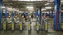 On July 19, 1909, service via the downtown tubes commenced between Hudson Terminal in Lower Manhattan and Exchange Place in Jersey City.[42] By this time, the Interborough Rapid Transit Company (IRT) had become a viable competitor, with a proposal to connect its Lexington Avenue line to the H&M at three locations: Fulton Street, Astor Place, and Grand Central–42nd Street. The Sixth Avenue portion of the H&M line also competed with the IRT's Sixth Avenue elevated, which extended both north of 33rd Street and south of 9th Street.[39]