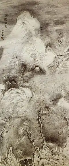 Uragami Gyokudō or Urakami Gyokudō (浦上玉堂 1745, Kamogata, Okayama - October 10, 1820) was a Japanese musician, painter, poet and calligrapher. In his lifetime, he was best known as a player of the Chinese seven-string zither, the guqin, but people came to appreciate his paintings after his death. His art features strong brushwork, often in patterns of strokes that build up a strong rhythm, and they reflect his musical compositions in relying on a limited number of possibilities that build up to powerful compositions. His Snow Sifted Through Frozen Clouds (紙本墨画凍雪篩雲図 shihon bokuga tōunshisetsuzu) is recognized as a National Treasure.