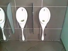 A urinal (US: /ˈjʊərənəl/, UK: /jʊəˈraɪnəl/)[1] is a sanitary plumbing fixture for urination only. Urinals are often provided in public toilets for male users in Western countries (less so in Muslim countries). They are usually used in a standing position. Urinals can be with manual flushing, automatic flushing, or without flushing, as is the case for waterless urinals. They can be arranged as single sanitary fixtures (with or without privacy walls) or in a trough design without privacy walls. Urinals designed for females ("female urinals") also exist but are rare. It is possible for females to use male urinals with a female urination device.[2]