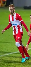 During the 2017 summer pre-season, Račić was presented as one of the club's top 10 youth prospects.[9] On 6 July 2017, Račić made his first continental appearance for the club, in the second leg of the first qualifying round for the 2017–18 UEFA Europa League, in a 3–3 draw against Floriana.[10] Račić scored his first senior goal for Red Star Belgrade in a 3−1 victory against OFK Bačka on 13 August 2017.[11] On the last day of the 2017 summer transfer window, Račić extended his contract with Red Star to 30 June 2021.[12] He also scored in a 2–1 victory over Mladost Lučani in the 14th fixture of the Serbian SuperLiga campaign.[13] His goal was proclaimed goal of the week in the domestic football competition, after which he won a wristwatch as a reward.[14] On 5 May 2018, Račić was fouled for a penalty kick, which was scored by Dejan Joveljić in 4–0 home victory over Spartak Subotica.[15] He scored and assisted teammate Nemanja Radonjić in the last season match against Voždovac on 19 May 2018.[16]