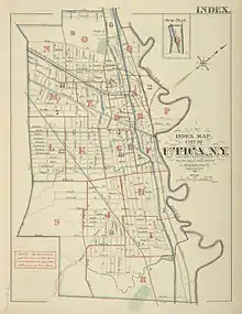 The boundaries of the village of Utica were defined in an act passed by the New York State Legislature on April 3, 1798.[28] Utica expanded its borders in subsequent 1805 and 1817 charters. On April 5, 1805, the village's eastern and western boundaries were expanded,[29] and on April 7, 1817, Utica separated from Whitestown on its west.[3][30] After completion of the Erie Canal in 1825, the city's growth was stimulated again.