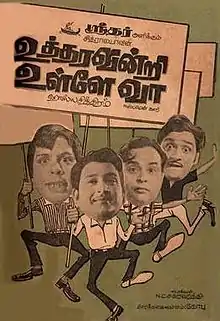 Uttharavindri Ulle Vaa (transl. Come inside without permission) is a 1971 Tamil-language Indian romantic comedy film, directed by N. S. Chakravarthi and produced by C. V. Sridhar under his production company Chitralaya Pictures. The film was written by Chitralaya Gopu, with music by M. S. Viswanathan. The film stars Ravichandran, Kanchana, Nagesh, Rama Prabha, Venniradai Moorthy and Gemini Mali in the lead roles, with Sachu, Thengai Srinivasan, Sundari Bai and Veera Raghavan in supporting roles.[1] The film was remade in Telugu as Vintha Illu Santha Gola.