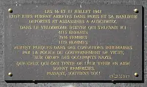 A plaque marking the Rafle du Vel' d'Hiv' was placed on the track building after the War and moved to 8 boulevard de Grenelle in 1959.[24] On 3 February 1993, President Mitterrand commissioned a monument to be erected on the site.[25] It stands now on a curved base, to represent the cycle track, on the edge of the quai de Grenelle. It is the work of the sculptor Walter Spitzer and the architect Mario Azagury. Spitzer and his family were survivors of deportation to Auschwitz. The statues represent all deportees but especially those of the Vel' d'Hiv'. The sculptures include children, a pregnant woman and a sick man. The words on the Mitterrand-era monument still differentiate between the French Republic and the Vichy Government that ruled during WW II, so they do not accept responsibility for the roundup of the Jews. The words are in French: "La République française en hommage aux victimes des persécutions racistes et antisémites et des crimes contre l’humanité commis sous l’autorité de fait dite ‘gouvernement de l’État français’ (1940–1944) N’oublions jamais", which translate as follows: "The French Republic pays homage to the victims of racist and anti-Semitic persecutions and crimes against humanity committed under the de facto authority called the 'Government of the French State' 1940–1944. Let us never forget."[26][24] The monument was inaugurated on 17 July 1994. A ceremony is held at the monument every year in July.