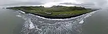 Vík lies directly south of the Mýrdalsjökull glacier, which itself is on top of the Katla volcano. Katla has not erupted since 1918, and this longer than typical dormant period has led to speculation that an eruption may occur soon. An eruption of Katla could melt enough ice to trigger an enormous flash flood, potentially large enough to obliterate the entire town. The town's church, located high on a hill, is believed to be the only building that would survive such a flood.[4] Thus, the people of Vík practice periodic drills and are trained to rush to the church at the first sign of an eruption. The town has 1,400 hotel rooms for scientists and tourists, who are also briefed about Katla's dangers.[5]