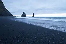In 1991, the US journal Islands Magazine counted this beach as one of the ten most beautiful beaches on Earth. Its stretch of black basalt sand is one of the wettest places in Iceland. The cliffs west of the beach are home to many seabirds, most notably puffins which burrow into the shallow soils during the nesting season. Offshore lie stacks of basalt rock, remnants of a once more extensive cliffline Reynisfjall, now battered by the sea. There is no landmass between here and the Antarctic and the Atlantic rollers can attack with full force. According to folklore, they are former trolls who tried to drag their boats out to sea only to be caught by the rising dawn. The sea around them is rather wild and stormy, so travelers will not be surprised to discover a monument to the memory of drowned seamen on the beach.