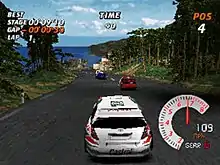 V-Rally is a racing simulation game where players drive rally cars through a series of stages or tracks.[1] The game places a strong emphasis on replicating the behavior physics of real cars and generally requires more practice than arcade-style racers.[1] Aspects such as the weather conditions, the road surfaces, and the drive wheel configurations have a significant impact on the car handling.[1] Weather conditions include rain and snow, while road surfaces range from asphalt to gravel or dirt.[2] Races can take place at night or during the day.[1] The game features both Kit Cars and World Rally Cars for players to choose from. Kit Cars are two-wheel drive and include cars such as the Peugeot 306 Maxi or Renault Maxi Megane, while World Rally Cars are four-wheel drive and include cars such as the Subaru Impreza WRC or Mitsubishi Lancer WRC.[3] Before starting a race, players have the option to tweak their car setup with tighter suspensions, quicker gear ratios, understeer or oversteer sensitivity, and choice of manual or automatic transmission.[4][5]