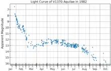 V1370 Aquilae faded rapidly after its discovery, and it had dimmed by three magnitudes in 13 days, making it a "fast" nova in the classification scheme of Cecilia Payne-Gaposchkin.[6][7] The light curve passed through a local minimum 43 days after the nova's discovery. That "dust dip", about 1 magnitude deep, resulted in the light curve being classified as type D.[8][9]
