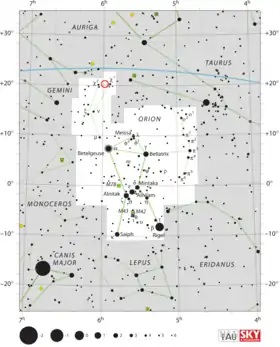 V529 Orionis, also known as Nova Orionis 1678, is a variable star which is usually classified as a nova. It was discovered on 28 March 1678 by Johannes Hevelius, who spotted it while observing a lunar occultation of χ1 Orionis, the star that forms the northernmost tip of Orion's club. Following the occultation of χ1 Orionis, Hevelius observed the occultation of another star by the Moon a few minutes later, which disappeared behind the first quarter Moon at 09:16 and reappeared at 10:29. Those details, combined with modern coordinates for χ1 Orionis, allowed Ashworth to derive coordinates, probably accurate to within a few arc seconds, for the 1678 nova.[3][4] V529 Orionis is sometimes referred to as Nova Orionis 1667 (for example the Simbad database makes this identification), but Ashworth argues against this identification[4] and the identification of the star during an occultation makes the year unambiguous. The maximum and minimum apparent magnitudes for this star are highly uncertain, but a peak brightness of magnitude 6 (barely visible to the naked eye) and a minimum of 20 was suggested by Duerbeck.[5]