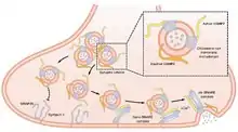 Synaptobrevins/VAMPs, syntaxins, and the 25-kD synaptosomal-associated protein SNAP25 are the main components of a protein complex involved in the docking and/or fusion of synaptic vesicles with the presynaptic membrane. VAMP2 is a member of the vesicle-associated membrane protein (VAMP)/synaptobrevin family. VAMP2 is thought to participate in neurotransmitter release at a step between docking and fusion. Mice lacking functional synaptobrevin2/VAMP2 gene cannot survive after birth, and have a dramatically reduced synaptic transmission, around 10% of control.[7] The protein forms a stable complex with syntaxin, synaptosomal-associated protein, 25 kD, and complexin. It also forms a distinct complex with synaptophysin.[6]