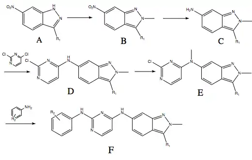 Pazopanib is a multi-targeted tyrosine kinase receptor inhibitor. The structure is formed by indazole, pyrimidine and a benzene ring.[23]
