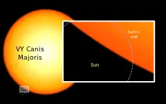 The radius of VY CMa is about 1,420 times that of the Sun (R☉), which is close to the Hayashi limit and corresponds to a volume nearly 8 billion times bigger than the Sun. A hypothetical object travelling at the speed of light would take 6 hours to travel around the star's circumference, compared to 14.5 seconds for the Sun.[21] If placed at the center of the Solar System, VY CMa's surface would extend beyond the orbit of Jupiter, although there is still considerable variation in estimates of the radius, with some making it smaller than the orbit of Jupiter.[4]