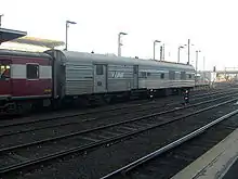 On 1 November 1997, the remaining passenger services operated by Australian National were sold to Great Southern Rail (GSR).[15] The sale included the standard gauge Overland passenger fleet - two roomette, four twinette sleepers; three first-class and six second-class sitting cars, three composite second-class sitting with buffet cars and two club cars. Power van PCO4 was also included in the sale, but at the time it was on broad gauge for the short-lived Explorer train, in a dark blue livery with wide yellow bands. It was converted to standard gauge in 1998 and given quick coat of grey paint.[16][17]