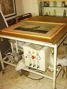 A vacuum table is a system for holding workpieces during machining. The device consists of a perforated table top containing a vacuum chamber, and a vacuum pump to keep the vacuum chamber below ambient enough pressure. The workpiece is placed on the top of the vacuum chamber and thus held down by the pressure differential between the vacuum chamber and the outside air.
