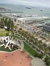 The fountain is in a highly visible spot on the downtown San Francisco waterfront, in Justin Herman Plaza, where Market Street meets The Embarcadero.[1] The Hyatt Regency Hotel is at the edge of the plaza, adjacent to the other four highrise towers of the Embarcadero Center. Across The Embarcadero is the Ferry Building, and the eastern end of the California Street cable car line is on the other side of the Hyatt Regency Hotel.